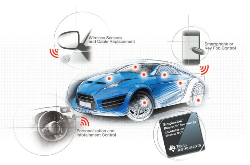 Wireless Sensors and Cable ReplacementThe upper left bubble shows how BLE eliminates traditional wiring by enabling wireless communication for various vehicle sensors, reducing weight and complexity in the vehicle’s electrical system.Smartphone/Key Fob IntegrationThe upper right bubble demonstrates the smart access capabilities, where BLE enables: