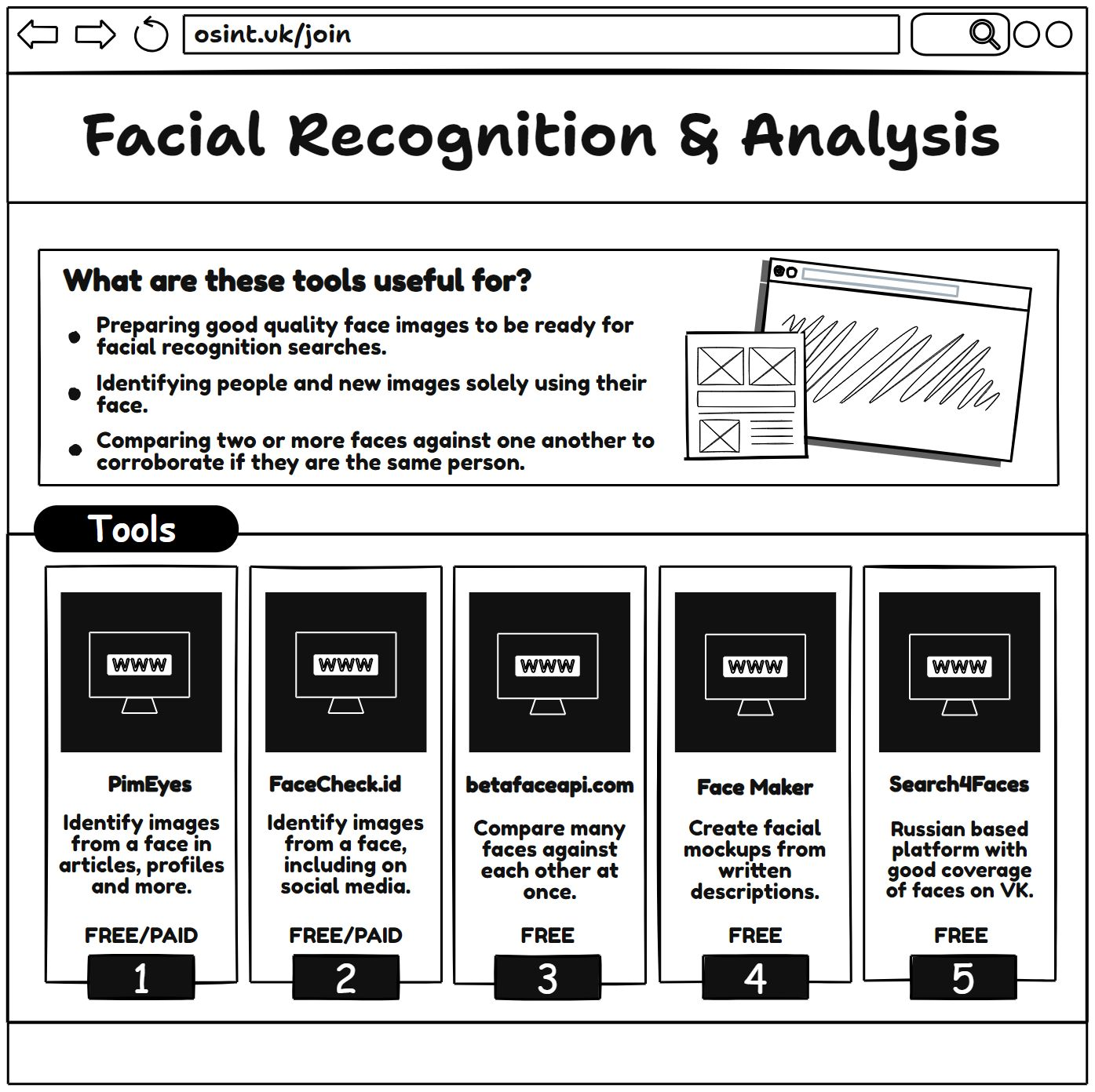 - A widely known framework that includes resources and tools for facial recognition and open-source intelligence.- Website: osintframework.com2. IntelTechniques OSINT Tools