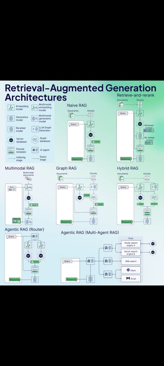 This image is a visual guide to the evolving ecosystem of retrievalâaugmented generation. Each RAG pattern helps ensure that when you query an LLM, it has the right context from relevant documents or data sources. Whether you use a straightforward âNaive RAGâ or a multiâagent approach depends on your data landscape, performance requirements, and how specialized your retrieval needs to be.