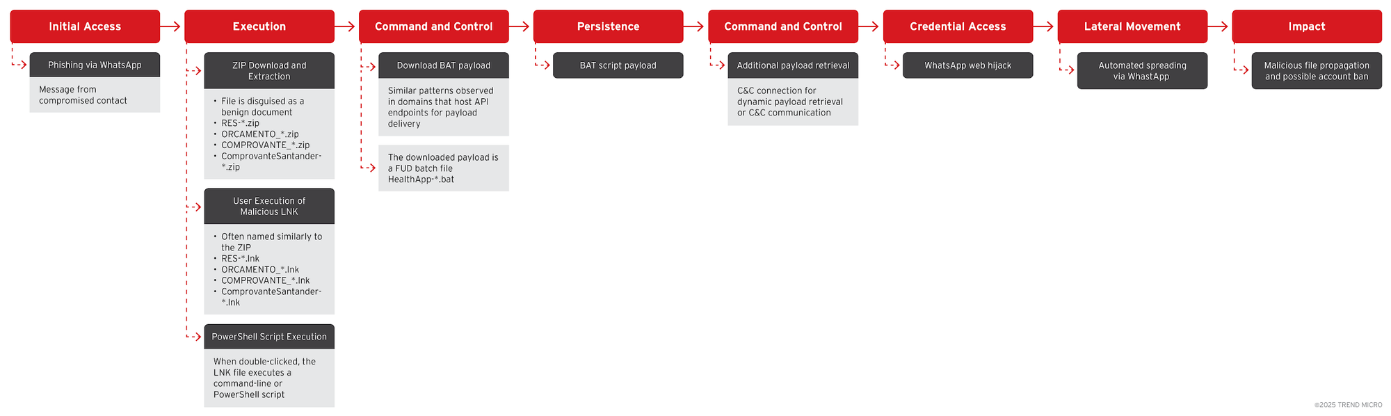 The infection begins when a user downloads and extracts a malicious ZIP archive from WhatsApp. The ZIP file contains a Windows shortcut (LNK) that, when launched, runs cmd.exe or PowerShell to connect to an external server to download the first-stage payload.